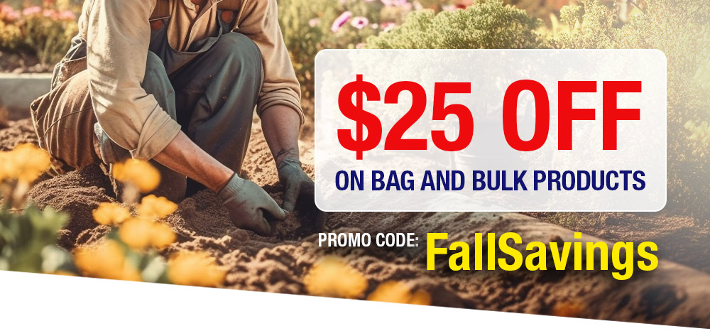 Use Promo Code FallSavings at checkout and take $25 off all bag and bulk products. From soil and mulch to stone and everything we sell by the bag or in bulk, stock up now and save while you still can.